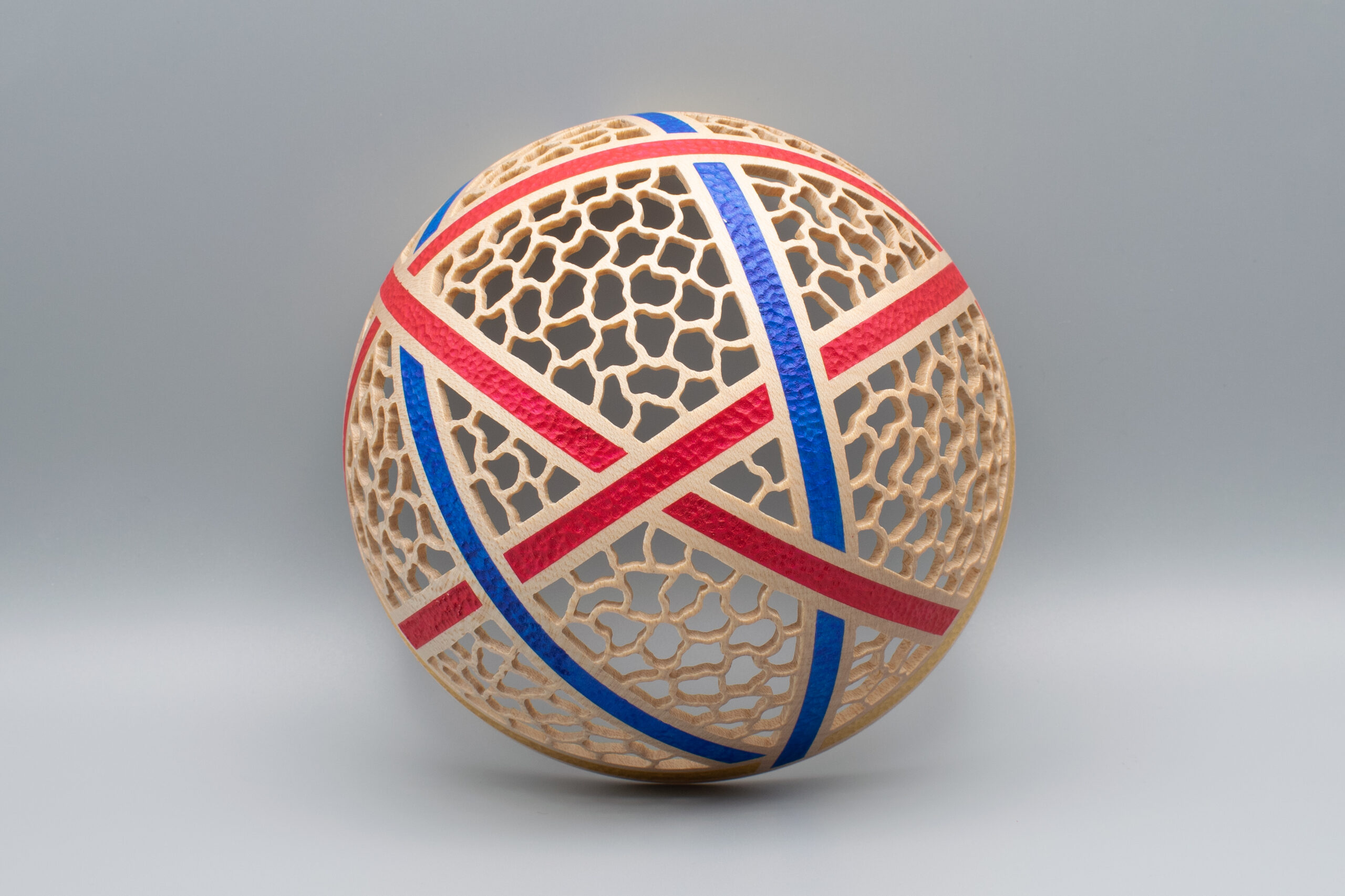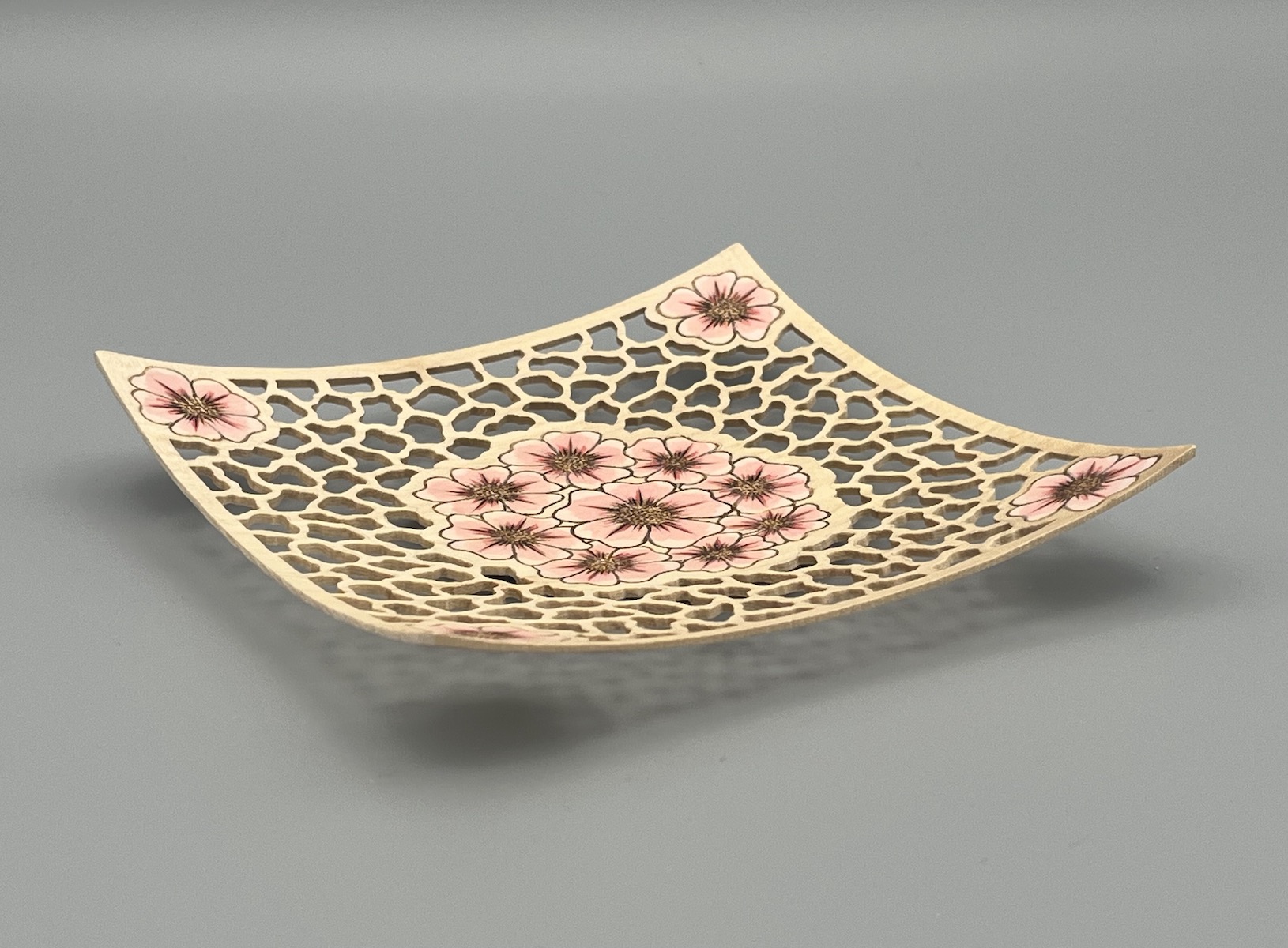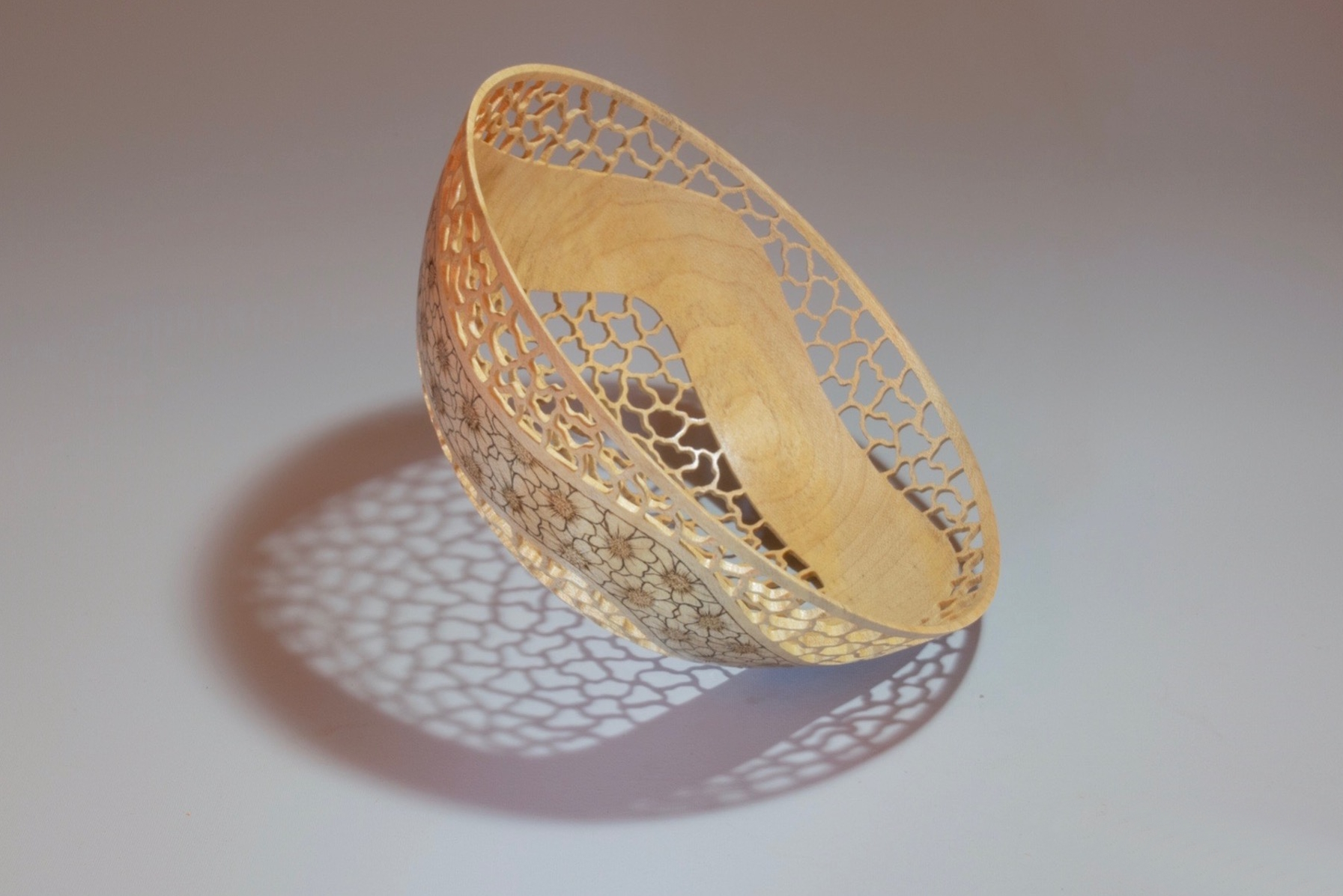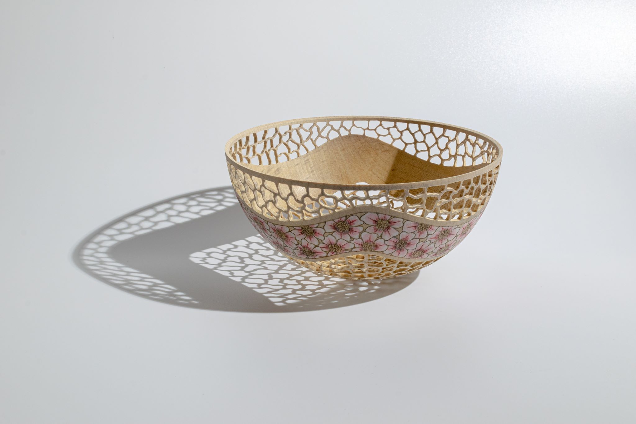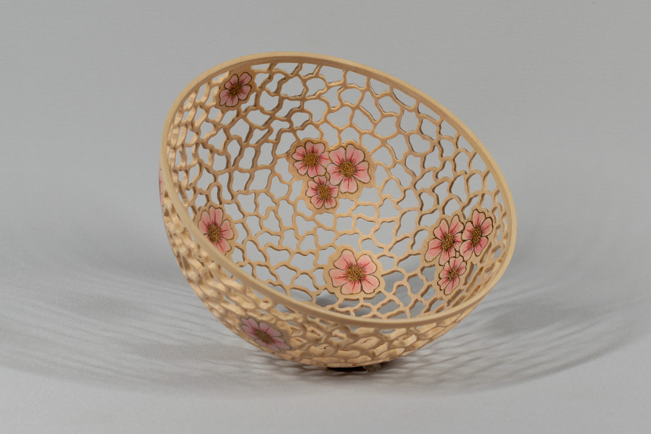 Made from English sycamore, pierced and decorated with painted pyrography. Finished with acrylic lacquer.