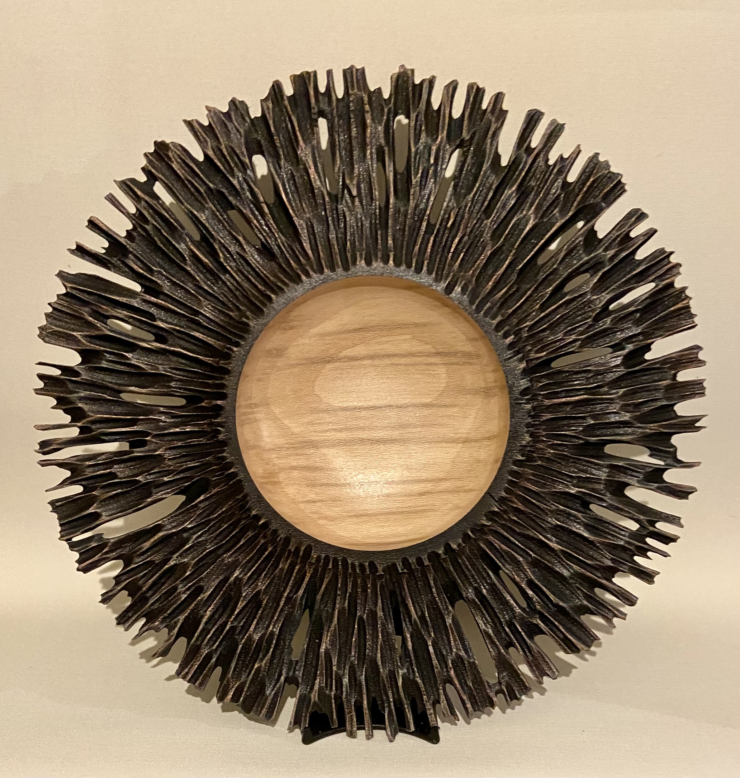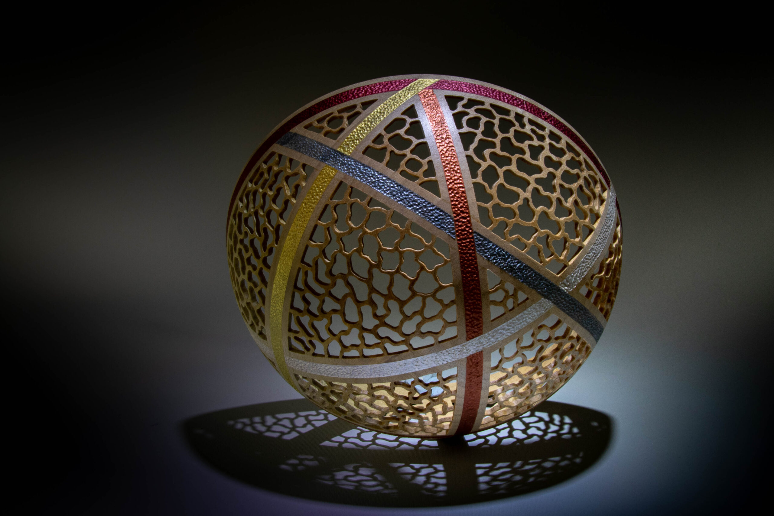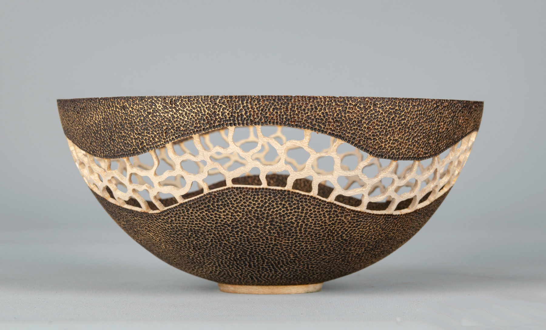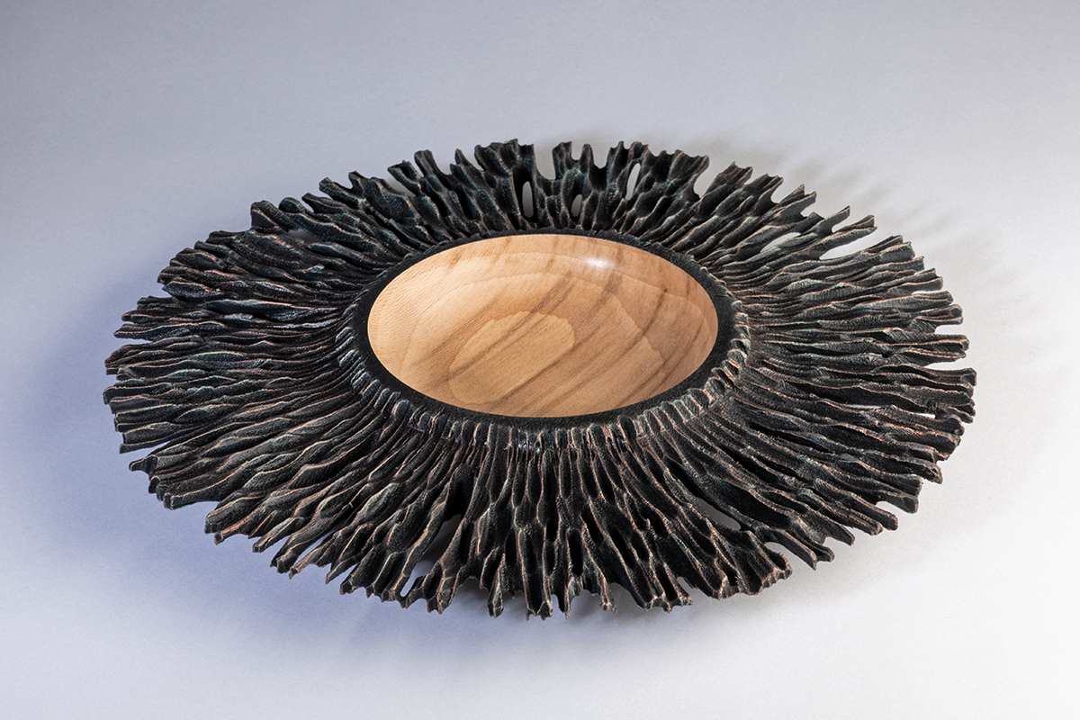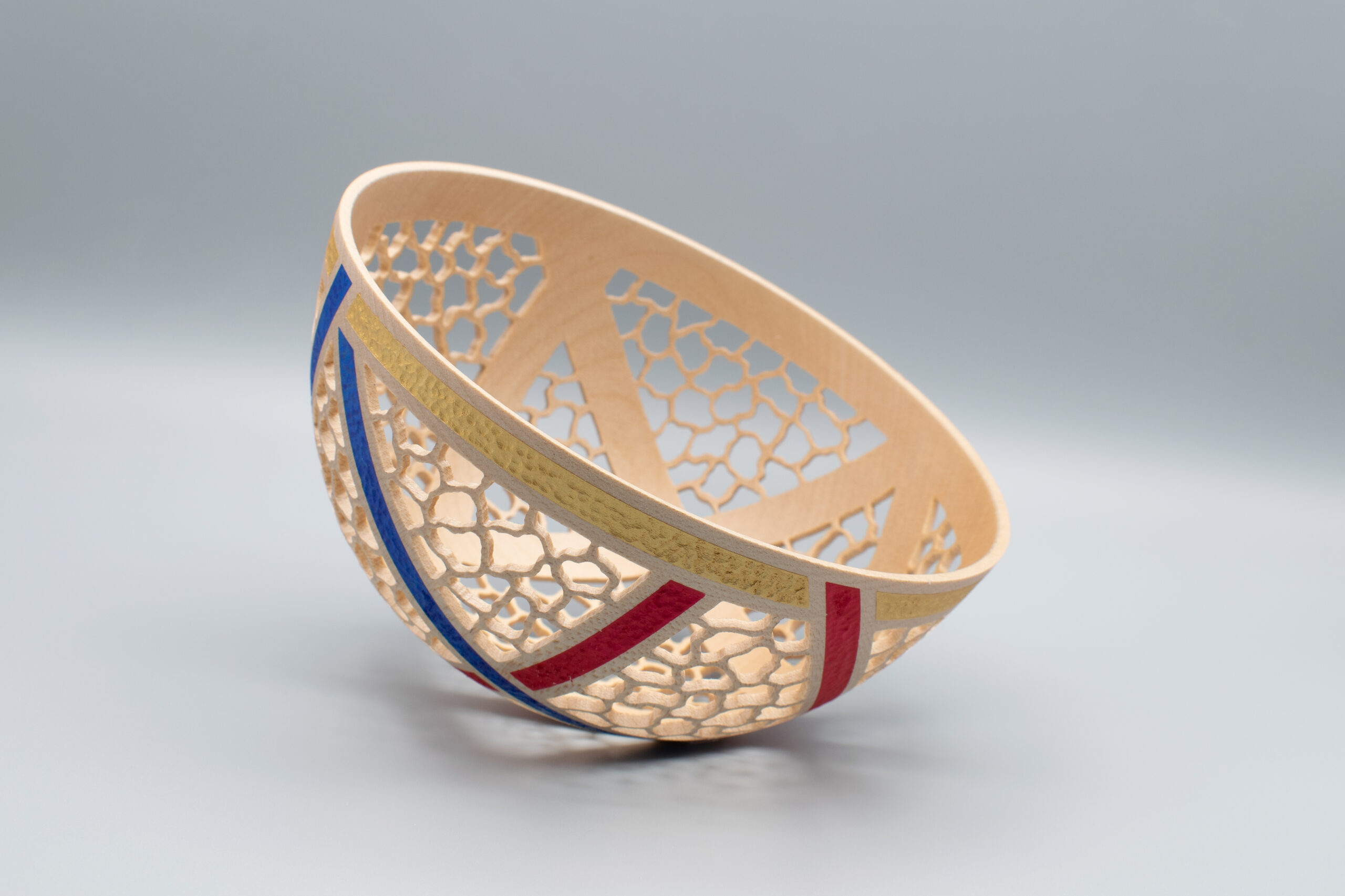 Made from English sycamore. measuring 6.2” diameter and 3” high, pierced, textured, coloured using metallic paints and finished with satin lacquer.
