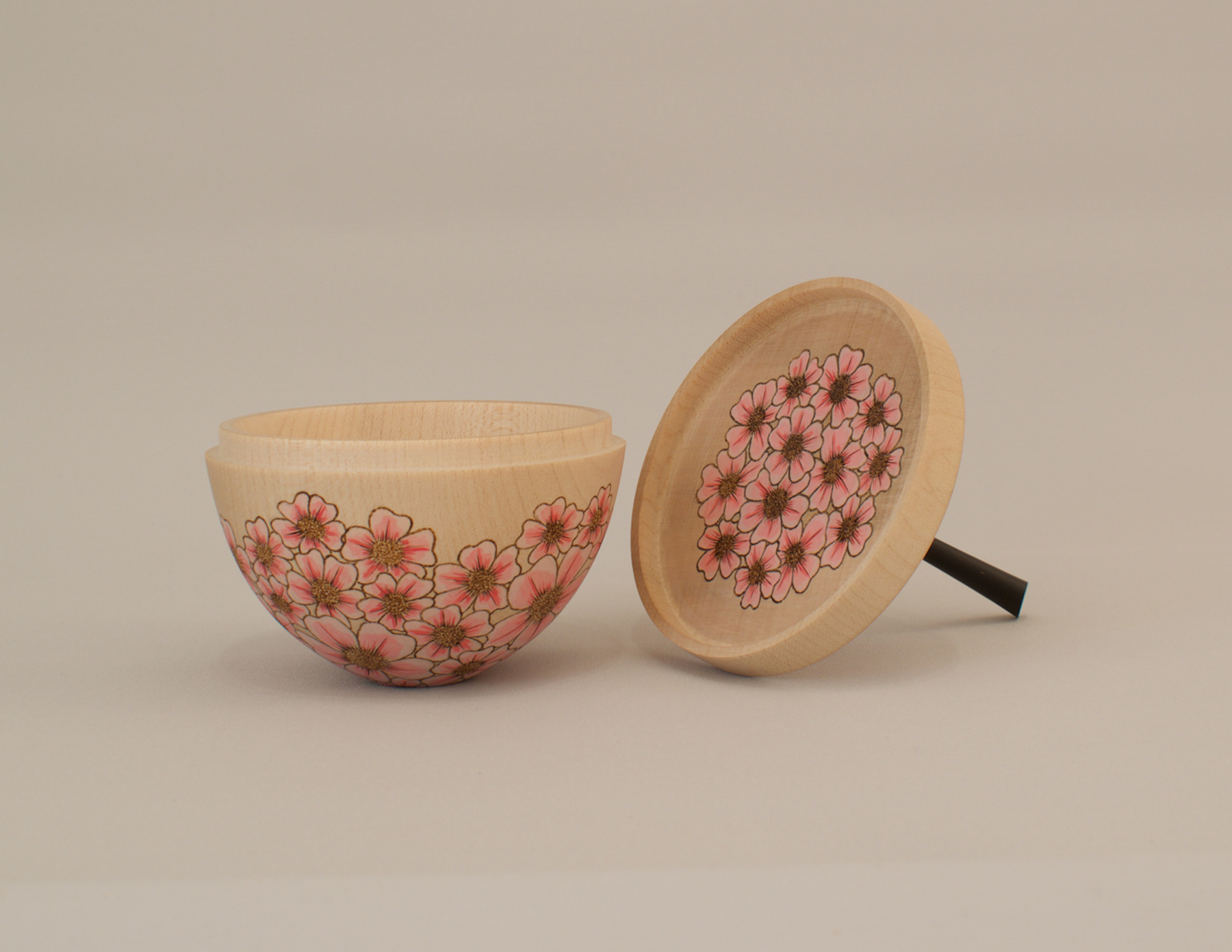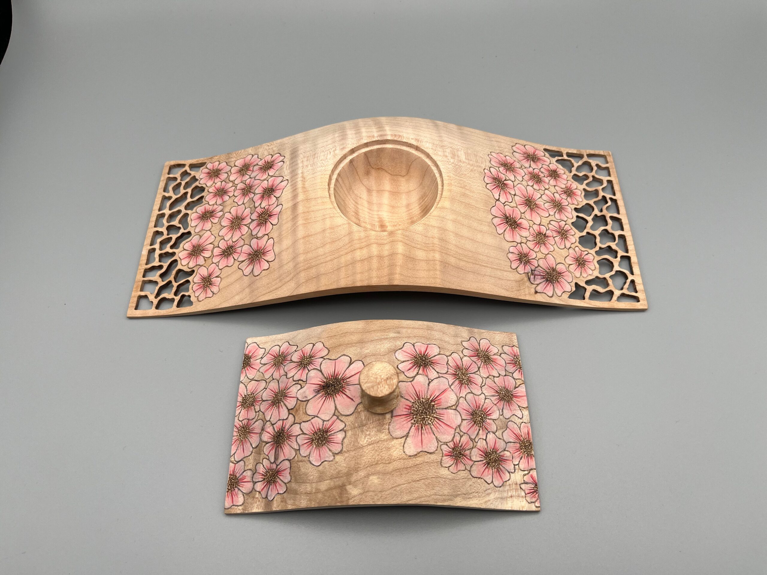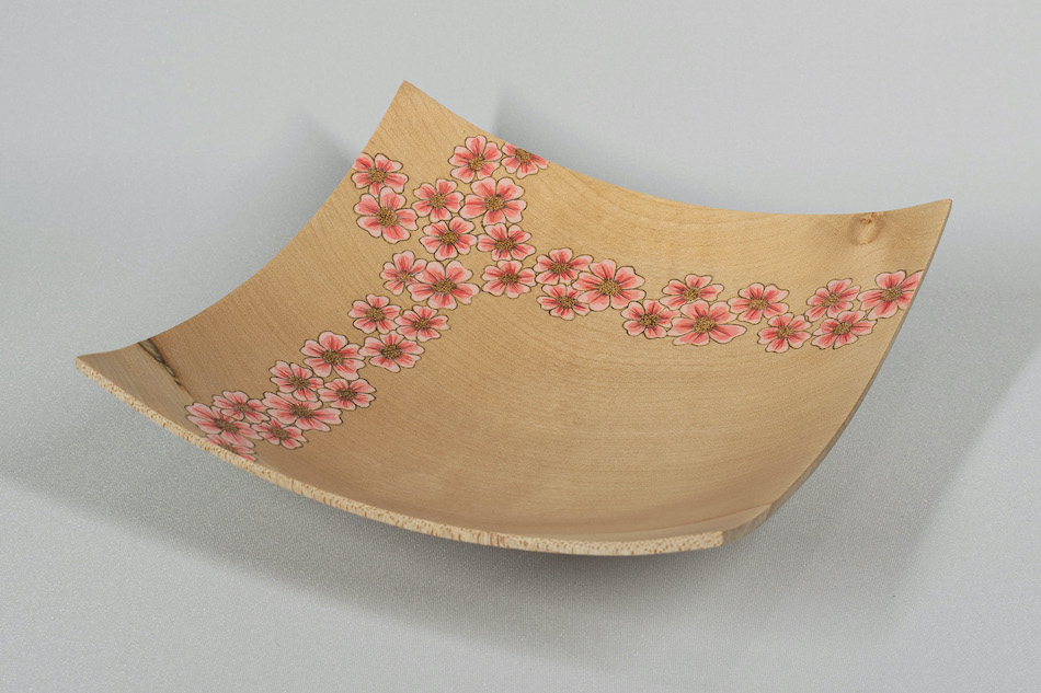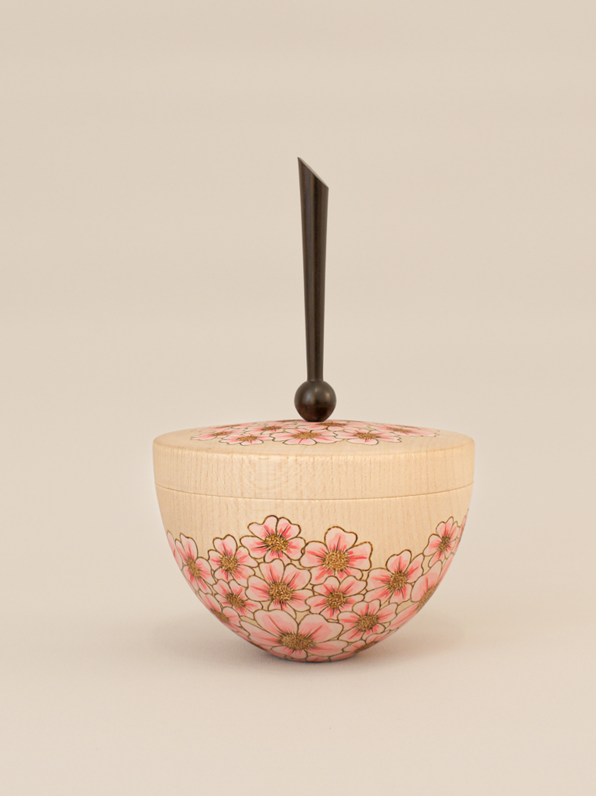Made from English sycamore and African Blackwood. The blossoms is created by using pyrography and acrylic paint. measuring 5.7" high and 3.7" wide.