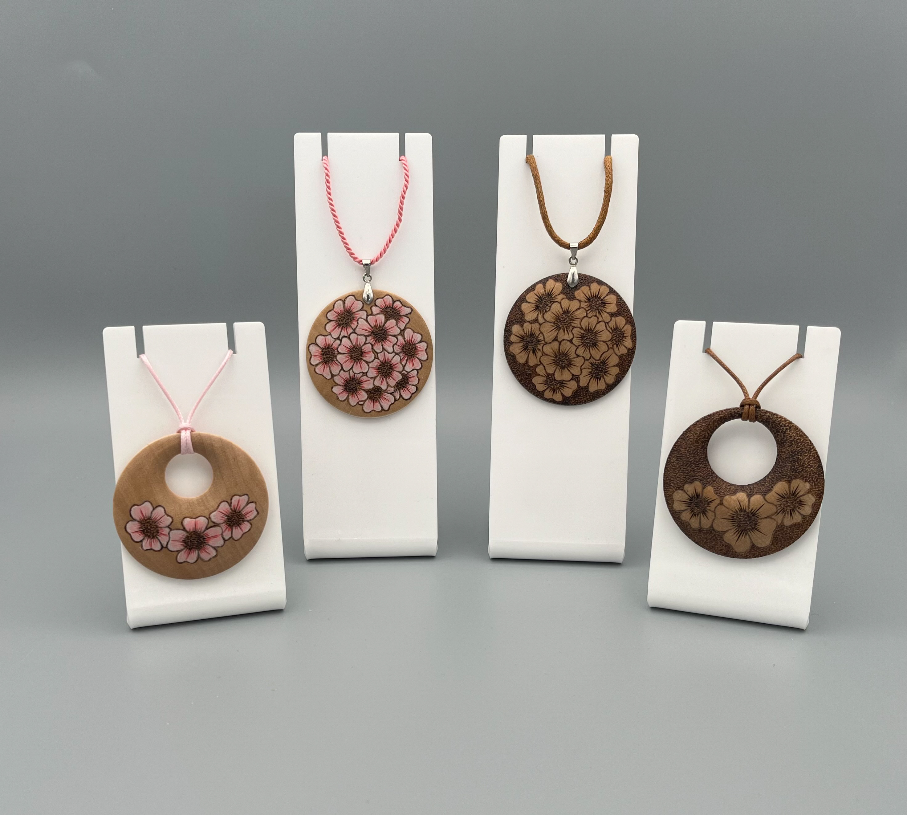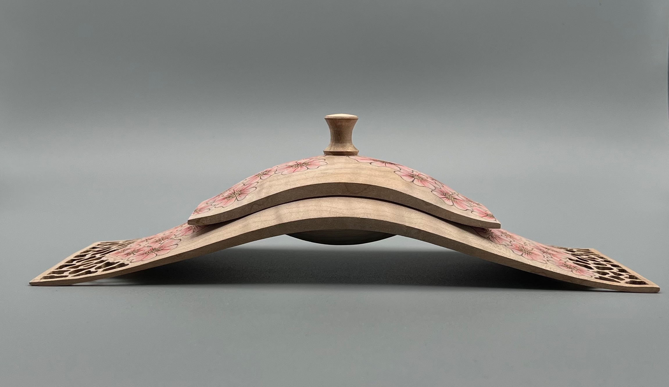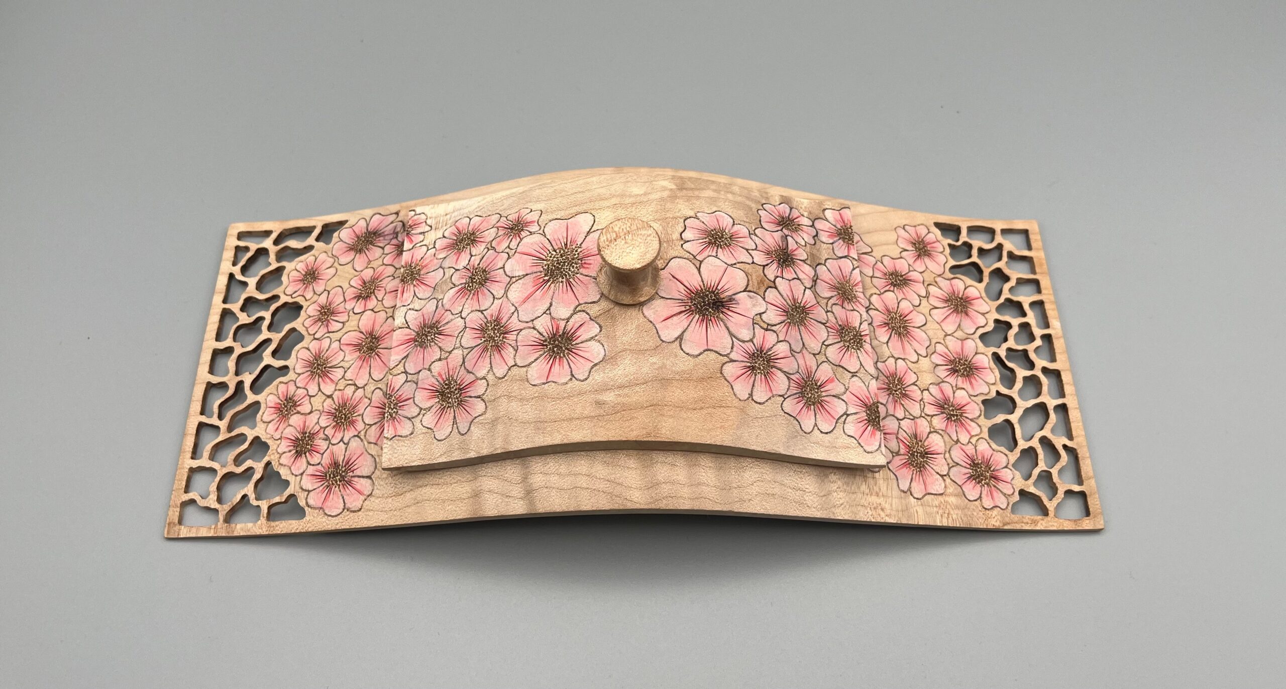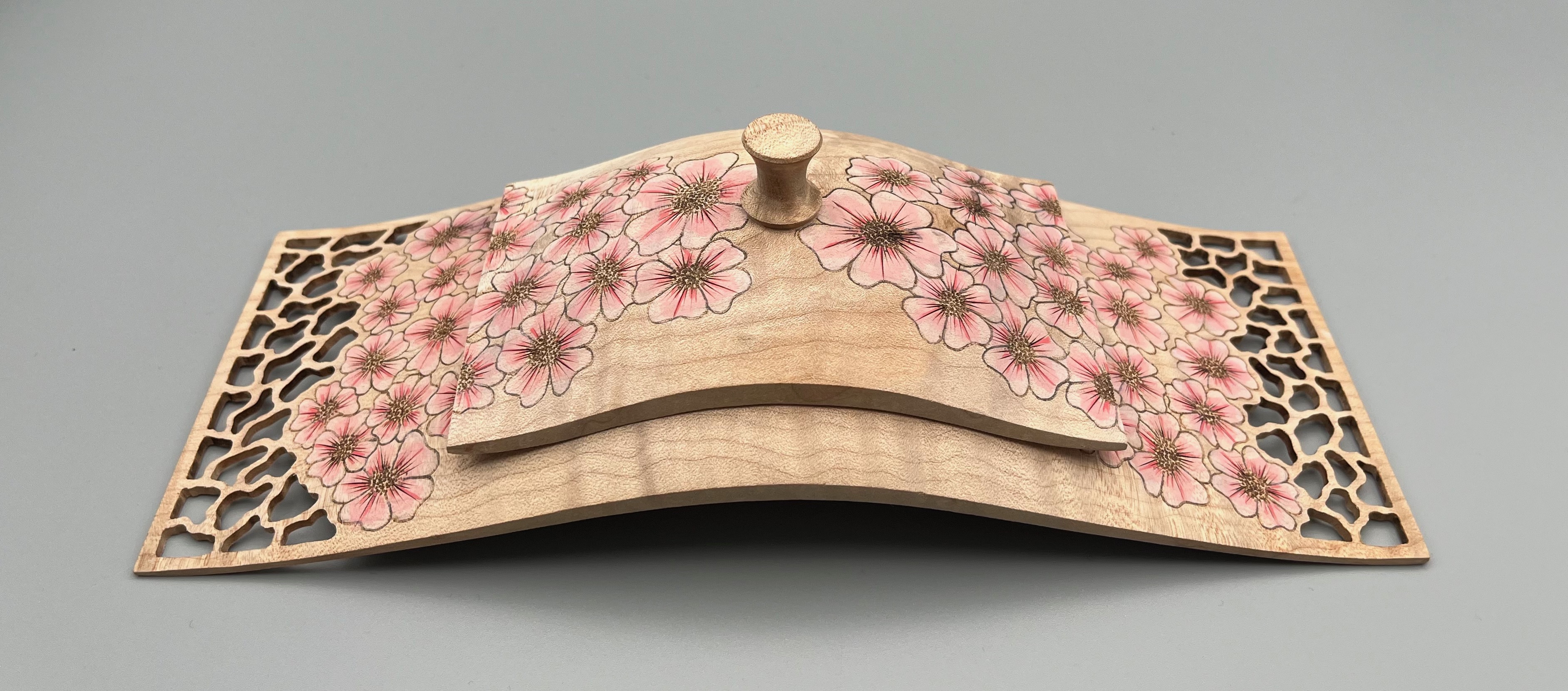 Made from English sycamore and African Blackwood. The blossoms is created by using pyrography and acrylic paint. measuring 5.7" high and 3.7" wide.