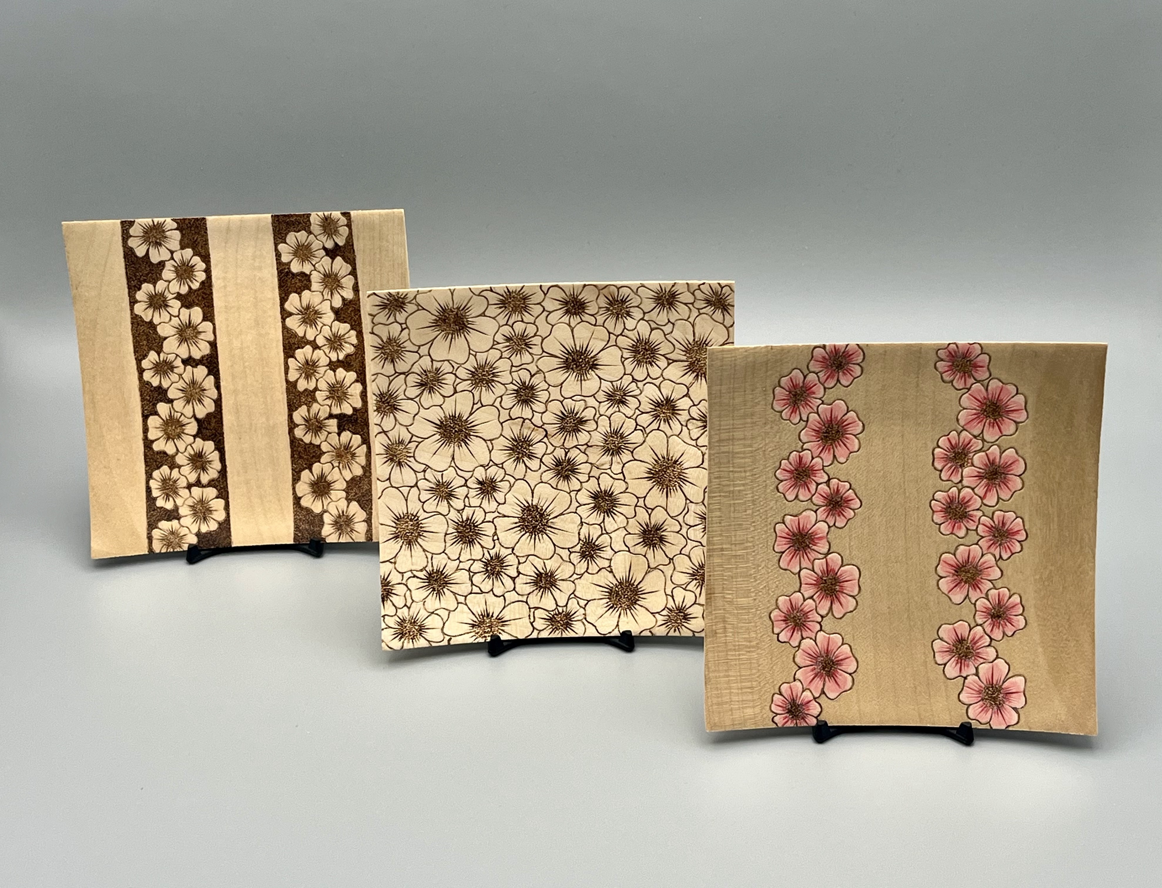 Another view of square platters made from English sycamore. Measuring 6" square. Decorated with Pyrography and acrylic paint and finished with acry...