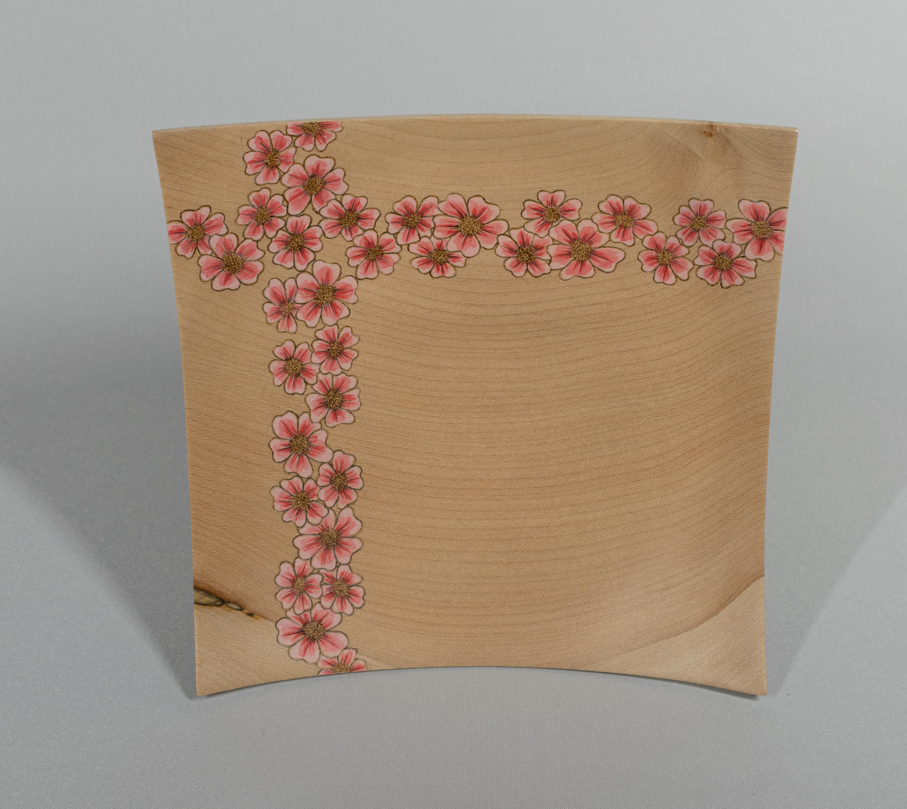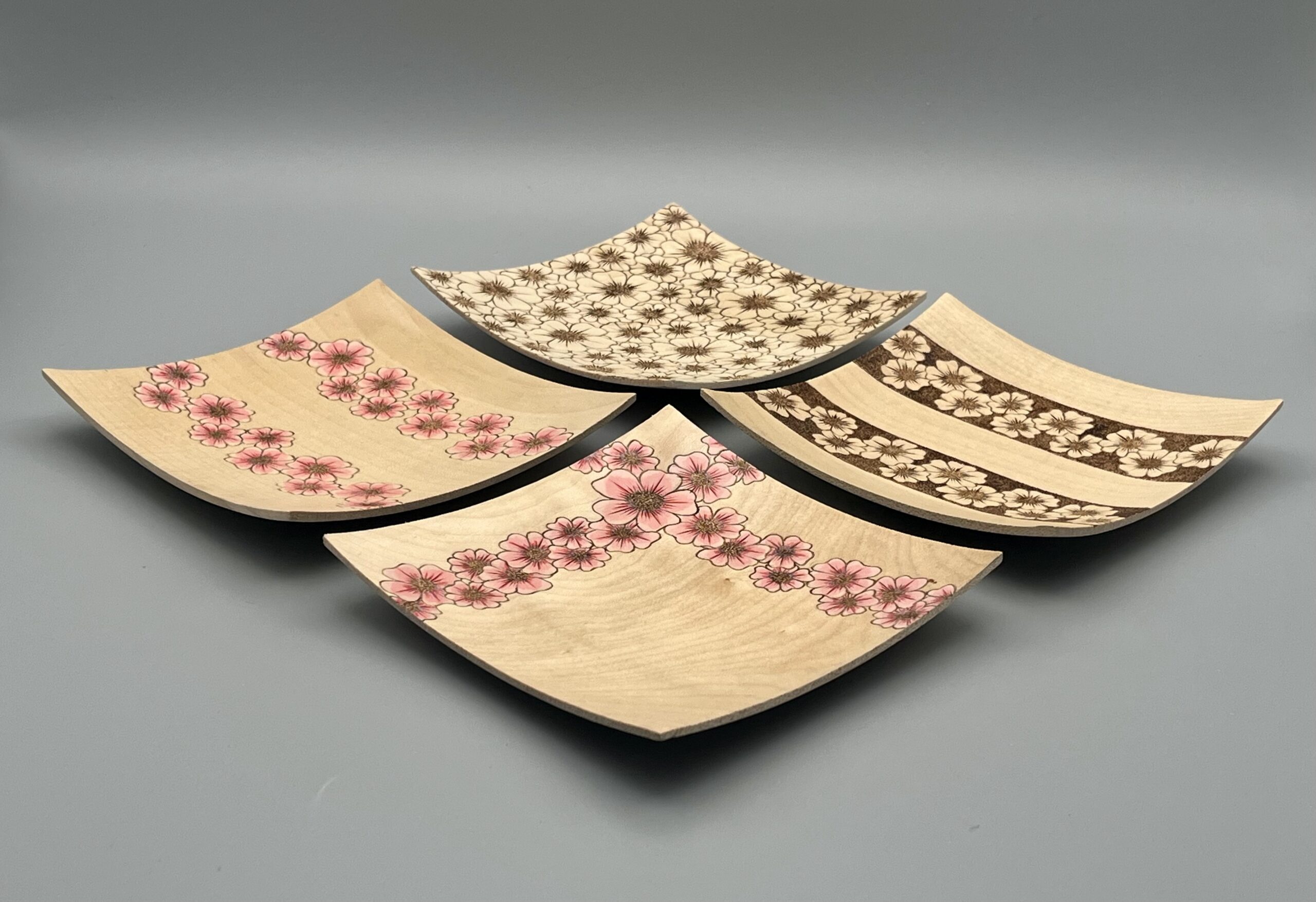 Another view of square platters made from English sycamore. Decorated with painted pyrography. Measuring 175mm square.
