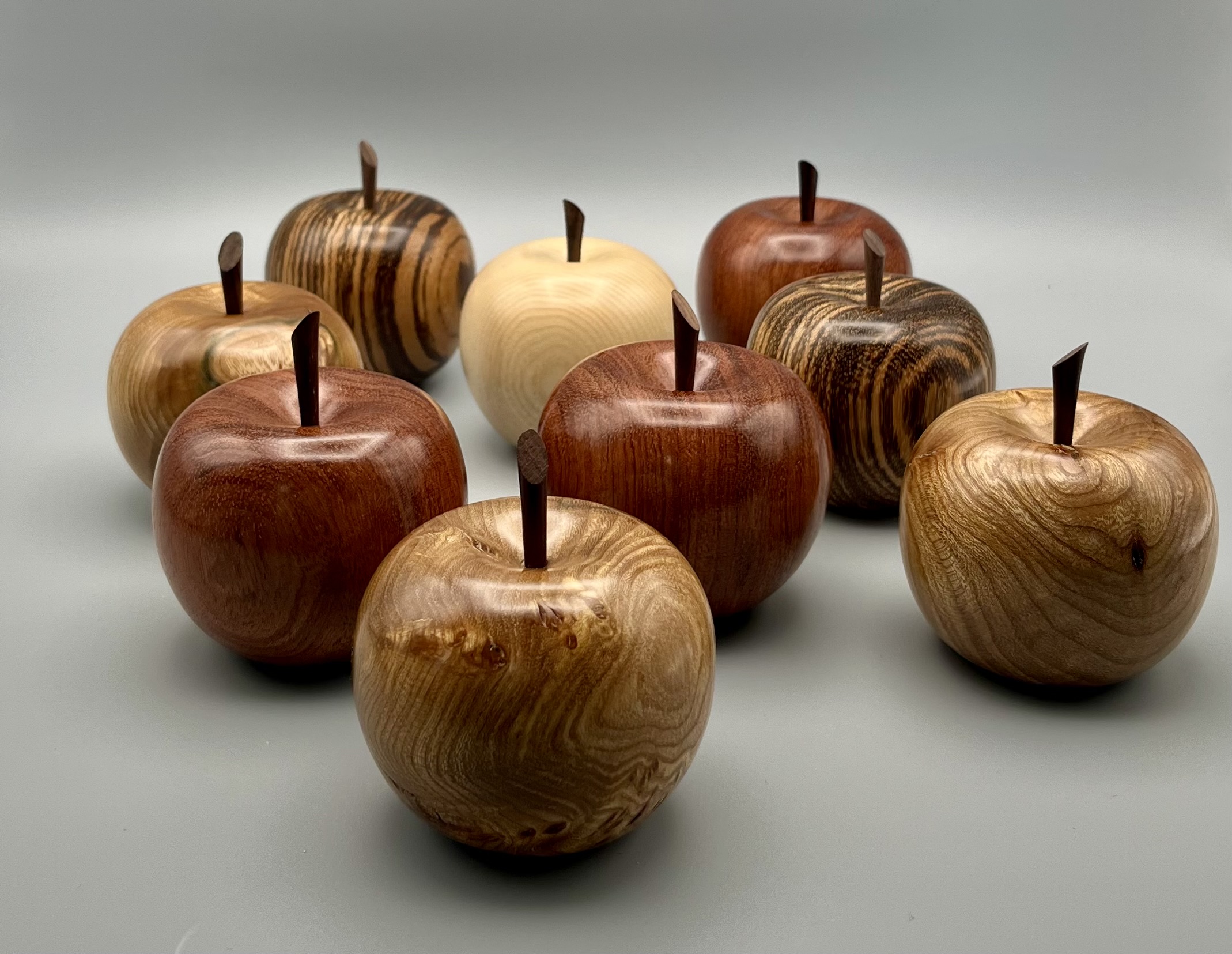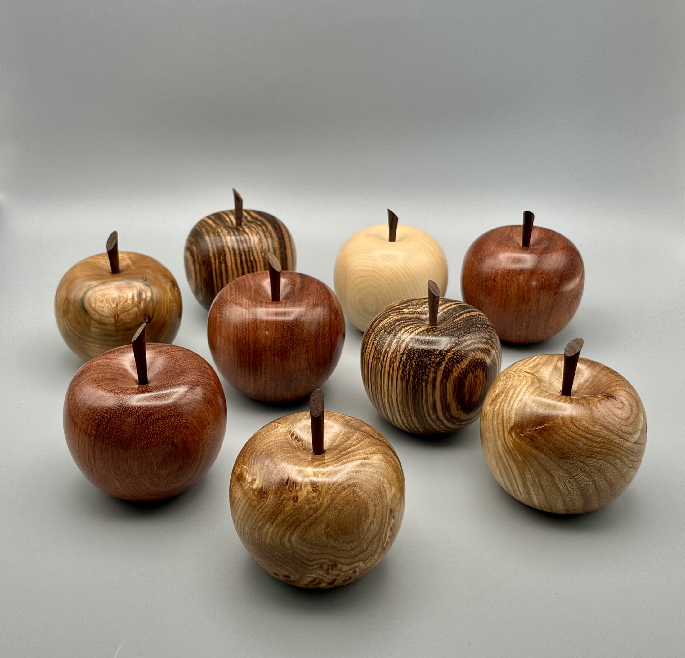 Another view of apples turned using various species of wood.