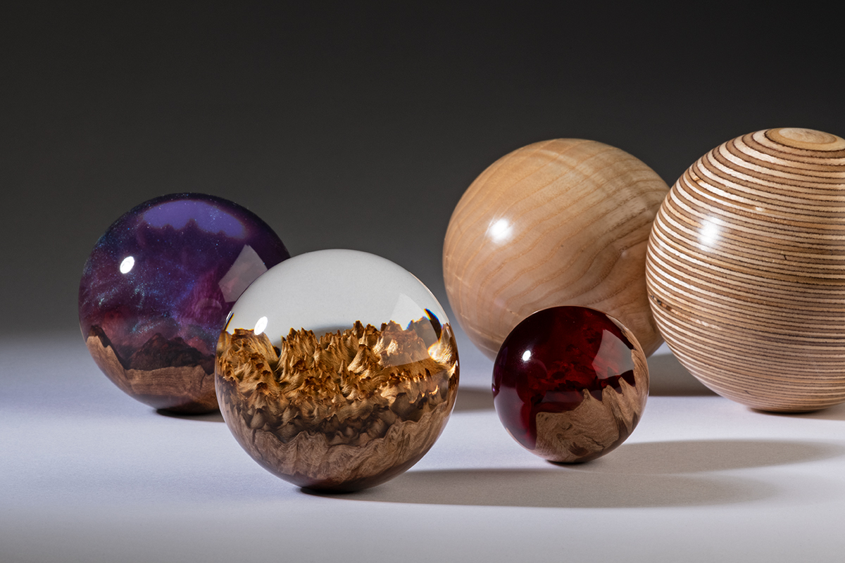 A collection of spheres made from resin and burr, burr sycamore and plywood.