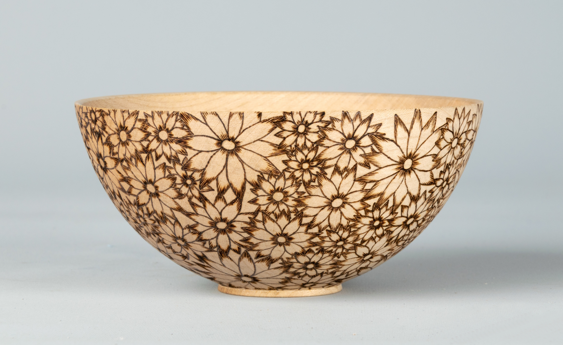 Made from English sycamore. 6" diameter and 3.5" high. Decorated with pyrography and finished with Satin lacquer.