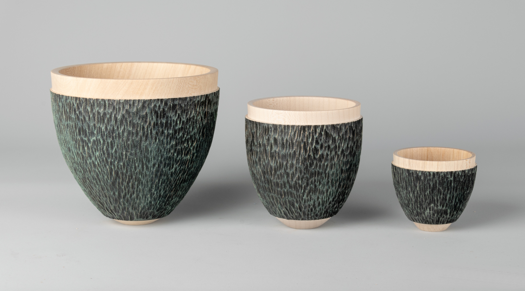3 vases in made from English sycamore. Measuring 135mm, 105mm and 65mm high. Textured and finished with Verdigris wax and gilt cream.