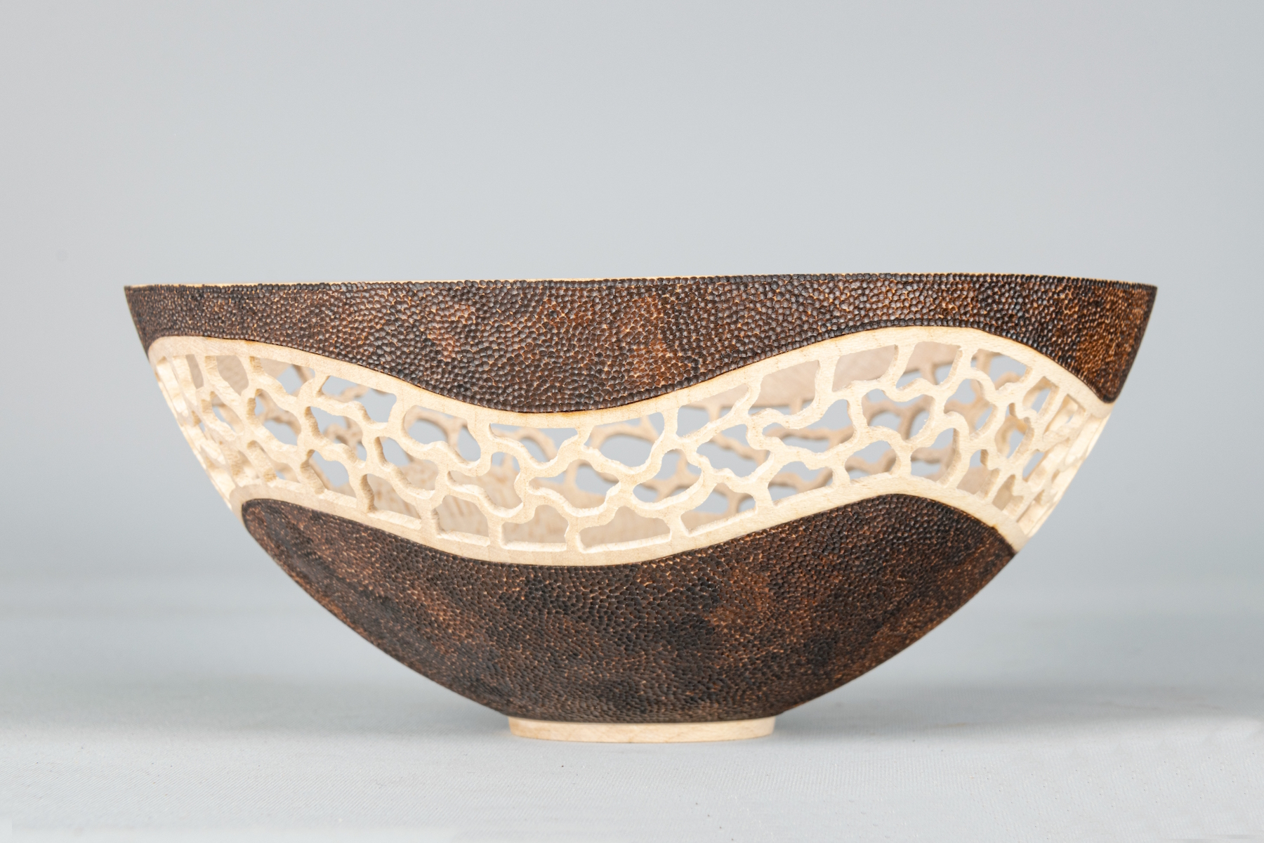 This is a collaboration piece turned by Jimmy Clewes then pierced and decorated with painted pyrography by me.
