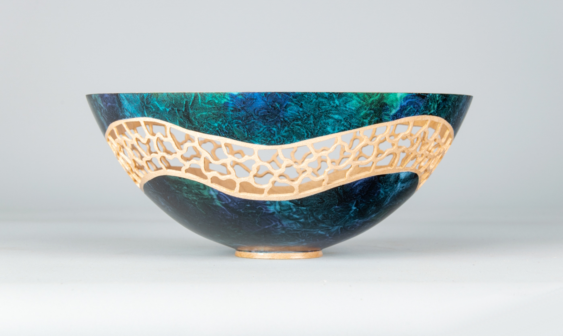 Made from English sycamore, pierced, coloured with iridescent paint and finished with acrylic gloss lacquer.180 mm diameter 75 mm high.